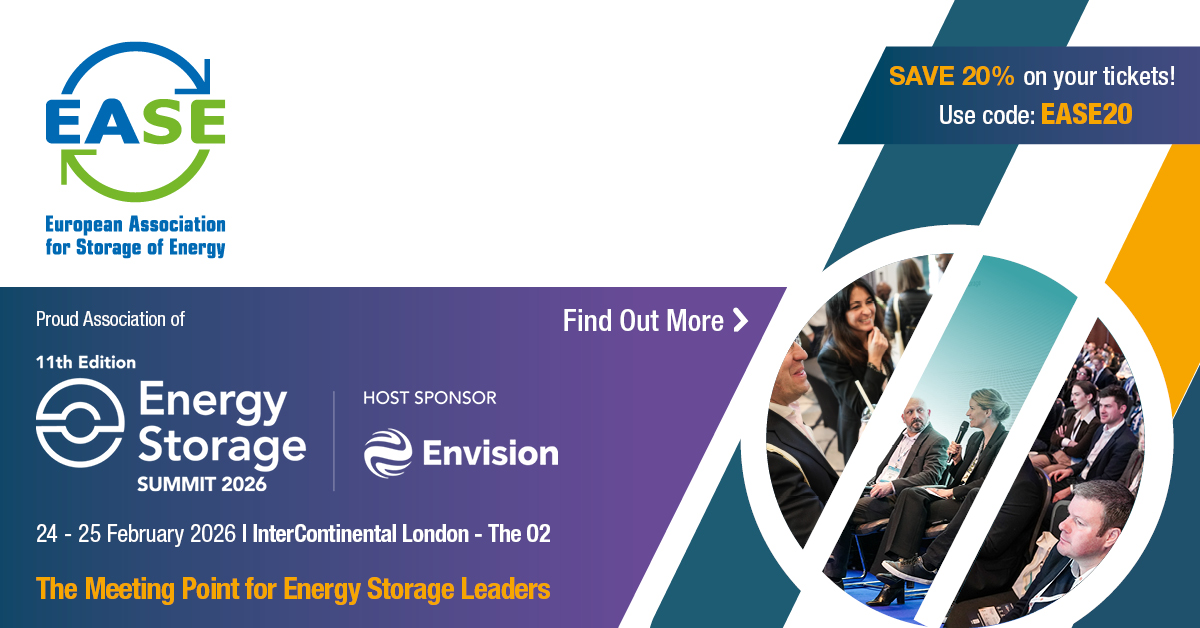 Energy Storage Europe Association is glad to support Energy Storage Summit, taking place on 24-25 February 2026 in London, UK. This summit aims to highlight the fundamental role that energy storage will play in this journey, and will strive to recognise, explore and analyse key challenges that may present themselves on the trajectory ahead.